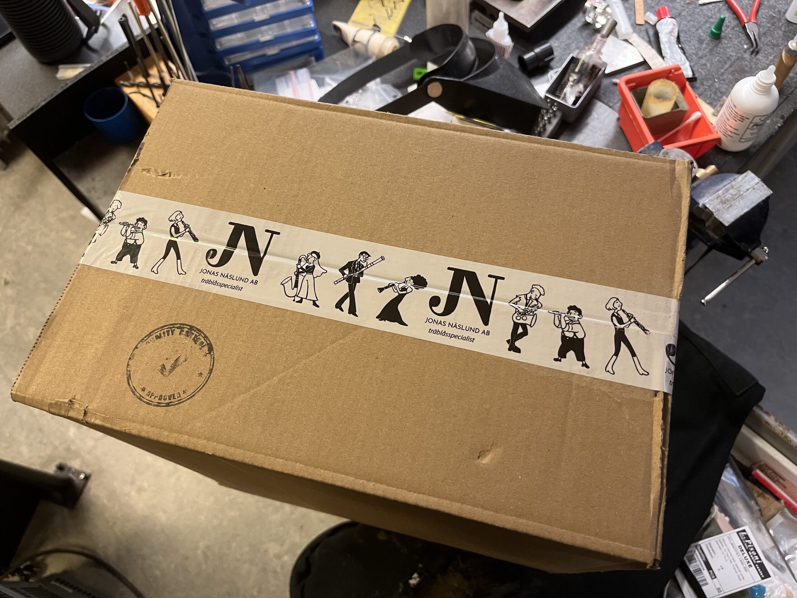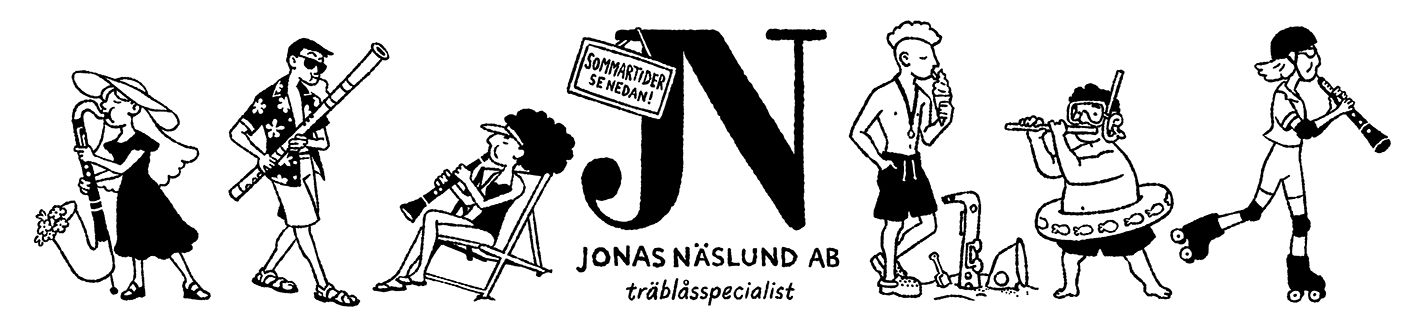 Woodwind repair shop Jonas Näslund AB wanted something personal to decorate packages with. Enter this packing tape design with all kinds of woodwind musicians.
